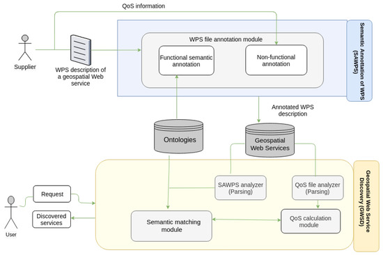 The contribution of this paper is twofold: (1) allowing for the creation of a semantic description for WPS according to the proposed annotation method (SAWPS); (2) supporting the discovery of a geospatial web service (GWSD) based on annotated descriptions. The functional architecture of the proposed SAWPS and GWSD approaches (illustrated in Figure 4) is composed of five modules: