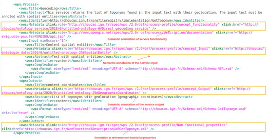 The proposed meta-model extends the abstract process model of WPS 2.0. In this way, as mentioned above, services can be described by functional properties (functionality and I/O) and non-functional properties (general and geospatial). An approach through annotation was chosen to instantiate the meta-model in the WPS description. Its implementation, based mainly on the use of the official metadata tag, ensures compliance with the standard. This tag has two attributes: role and href (role identifier indicates the role of the metadata and href references the metadata with HTTP (Hypertext Transfer Protocol)-URI (Uniform Resource Identifier) value type). Therefore, the annotations will be recorded in the metadata tag in the form of simple links with an appropriate role identifier. Table 2 (the presented HTTP-URI are not accessible on the web. They are mentioned as examples for illustration purposes) describes the defined new roles and the reused one (first line in the table).