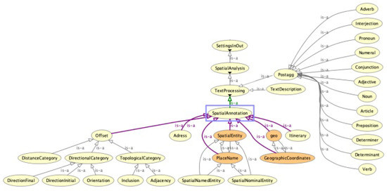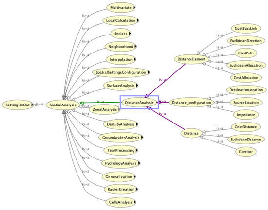 The first request (R1) corresponds to the search for a distance calculation service and the second request (R2) corresponds to the search for a direct geocoding service. Remember that only the geocoding service has real values for non-functional properties, which is why the R2 query was chosen here. The R1 query represents the situation where the values for the non-functional properties have been simulated. In the corresponding tables, the three columns show the functionality and the I/O of the required service. These tables are accompanied by extracts from the service ontology (see Figure 6 and Figure 7) and extracts from the data ontology (see Figure 8 and Figure 9) in order to show, for the presented requests, the concepts related to the functionalities and I/O. The figures show the class hierarchy in the ontologies described with is-a relations between classes and sub-classes. The orange color shows the equivalence of two classes. The purple and green color on the relationship arrows show the child and parent classes, respectively, of a selected class. The selected class appears surrounded by a blue border.