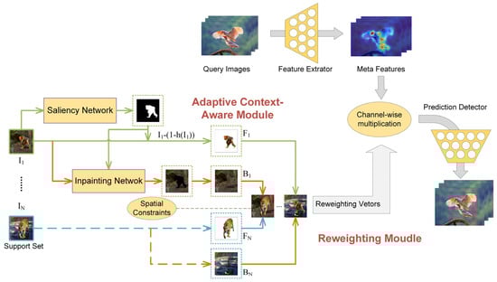 Inspired by the generative learning model [], we form a scene-shared view in the new reconstruction paradigm. It would be helpful to adapt to nonstationary and uncertain environments. To reflect scene changes and uncertainties, we propose a few-shot object detection pipeline with adaptive context awareness named FRW-ACA. Our approach makes full use of the context information in the images of endangered animals. To make the process tractable, we use a feature extractor that learns how to extract meta-features from the input query image for endangered-animal detection. For adaptation to the detection task, we also use the feature reweighting module to convert several support instances in the endangered-animal category into a global vector, representing the importance or correlation of meta-features for detecting the corresponding object. The detection predictor regresses the features and directly outputs the object classification score and the bounding box.