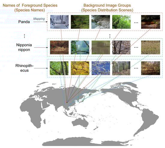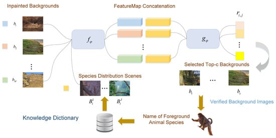 (1) Knowledge Dictionary. The knowledge dictionary module has an image dataset that takes the name of the foreground species (species name) as input and returns a set of conceptually related background image groups as output (species distribution scenes). Figure 2 presents the architecture of the knowledge dictionary.