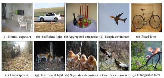 The emerging field of data-rich science has adopted computer vision models for pattern recognition to identify numerous animal species through phenotypic appearance []. In practical terms, individual animal identification methods have been applied to lemurs [], macaques [], and chimpanzees []. A substantial hurdle is developing robust models to perform on highly challenging datasets, such as those with cluttered backgrounds []. The issue could accomplish background subtraction with thresholds and color matching []. Recently, deep learning has made it possible to analyze animal biometric datasets and perform complex imaging tasks, including segmentation and classification [,]. While these methods have made valuable contributions, they are not robust to inevitable environmental variations. The challenge is to develop models that would work well in images with poor illumination or uncertain environments []. Concerning the studies using deep learning, individual reidentification has been critical to research on animal behavior in the wild []. Still, this alone cannot capture the full complexity of animals and environments. Existing approaches based on temporal or spatial features are limited in adaptive capability. Additionally, they require a stable and stationary environment, making it inherently challenging to detect unknown endangered animals. In practice, the essence of wild-animal detection approaches lies in the quick adaptation to novel data, thus remaining an open challenge.