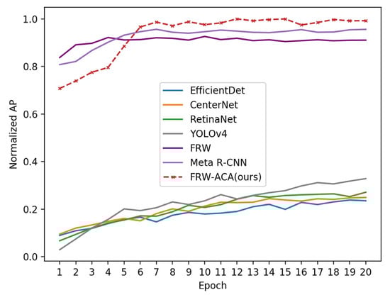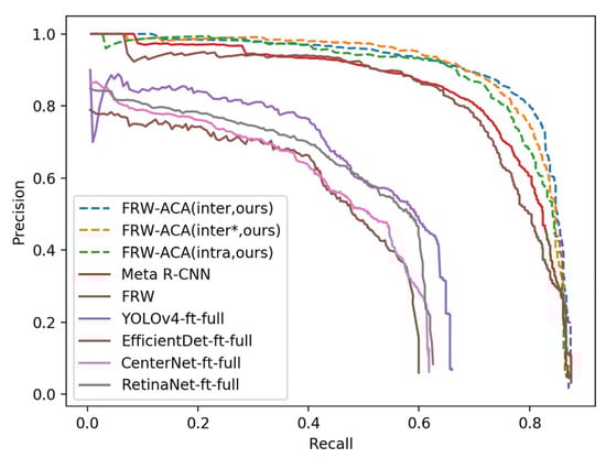 Our few-shot detector is constructed based on the detection framework of the one-stage model. Considering the most advanced one-stage models combined with few-shot learning strategies, we choose the YOLOv4 model [] as the baseline, including the YOLOv4-joint and YOLOv4-ft, and YOLOv4-ft-full. Another baseline is a general few-shot object detection model FRW, which mainly uses the feature reweighting module to make full use of the characteristics of the base class. It extracts the generalized meta-features to detect novel objects. We also compare our method with other object detection models, such as EfficientDet [], CenterNet [], RetinaNet [], and Meta R-CNN [].