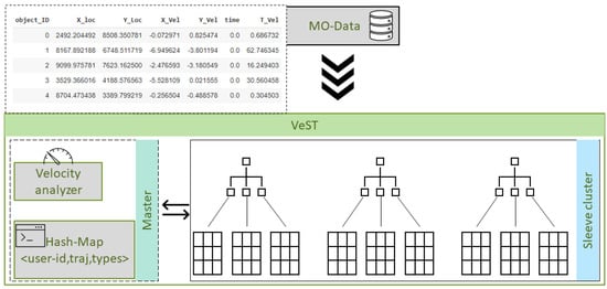 Our velocity spatiotemporal index consisted of space–time and velocity data. It analyzed moving objects’ velocity and then indexed their data across a hybrid distributed structure. VeST was designed to have two main parts, primary and secondary. A primary/secondary paradigm signifies that one server was configured to operate as the primary node. It was then directed to acquire all of the written queries. The primary node then performed and logged the queries, which were then dispatched to the secondary nodes to conduct and keep the identical data across all counterpart components. In the primary/secondary structure, the write functions were executed at the primary level and read functions at the secondary level [29]. Therefore, all search requests initially reached the primary node, a queue of submissions was preserved, and the read function was accomplished solely behind the fulfillment of the write operation. There is a common problem in a primary/secondary configuration, which is also witnessed when the primary node’s queue becomes too large to be maintained. This architecture collapses, and the secondary nodes start behaving as the primary one.