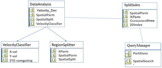 Figure 3 illustrates the structure of the indexing model, its objects, their behavior, and operations. The “DataAnalysis” class contained the spatial attributes of the query and the velocity deviation, which were generated by the “VelocityClassifer” object in order to partition objects based on their velocities. The k parameter of a CKNN query was used to process iterative search operations over the index structure’s partitions after the region’s spatial split.