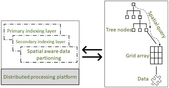 We proposed using a multilayer structure for distributed processing platform, as illustrated in Figure 4. Distributed processing modules consist of three layers, a first one for the primary indexing node, a second layer for the set of the secondary indexing set, and a spatial data partitioning layer. Individual nodes created their index for all locally reserved records in the secondary indexing layer. Therefore, each node had a shortlist of objects data. A query was initially broadcasted to every node, and then the derivatives were integrated. Therefore, each node had a more diminutive number of prolonged lists. Under the standard query evaluation procedure, a query was first routed to the node maintaining the list for a more concise list, which then dispatched its entire list to the node containing the main list [30].