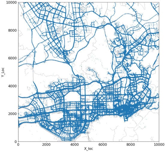 The total size of the data set used was 46.9 MB. The data were generated through OpenSourceMap with the space domain of 10,000 × 10,000 for Shenzhen City [31]. Table 3 shows the summary of the dataset. The dataset contained six columns and 1,025,486 rows, with only one row containing null values. The first column represented the ID of each object, where the minimum object ID was 0, and the maximum ID was 10928. The second and third columns were for the location X_loc and Y_Loc according to the X and Y axes, respectively, representing longitude and latitude; whereas, X_Vel and Y_Vel represented the velocity on the X and Y axes. The maximum velocity on the X-axis recorded was 33.25 and on the Y-axis was 33.19. The last column, “time”, contained the tracking timestamps.