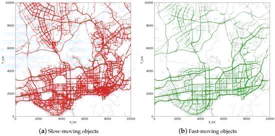Figure 5 shows the sampled locations of moving objects in the city. The location of taxis also sketched the outline of the city’s road network. Figure 6 illustrates the objects after classifying them according to their velocities with regard to the actual velocity deviation. Figure 6a shows the visual representation of slow-moving objects with red dots, whereas Figure 6b shows the fast-moving objects with green dots.