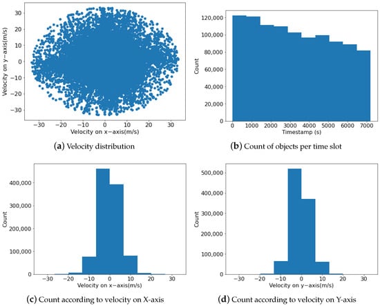 Figure 7 shows the distribution of different features of the dataset. Figure 7b shows the velocity distribution across the X and Y-axis. Most of the points lay between −30 and 30 m/s. Figure 7b shows the count of objects per time slot from 0 to 7199. It can be observed that the time between 0 to 1000 contained the highest number of objects and 6000 to 7000 contained the lowest number of objects. Figure 7c shows the count of objects according to the velocity on the X-axis. Figure 7d shows the count of objects according to the velocity on the Y-axis. In both the X and Y-axis velocity distribution, the maximum count was between −10 to 10.