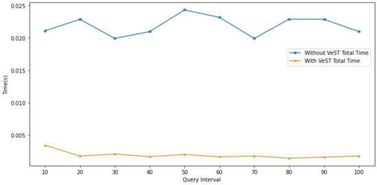 We conducted extensive experiments on the dataset presented in the previous section. We performed simulations and plotted various graphs to represent the proposed approach’s performance from the perspective of the working hypotheses. Intending to investigate by how much the proposed approach was faster than the conventional approaches in terms of processing time, we compared the querying time for various query intervals for a CKNN search where k was set to 7. We compared the time when using the proposed approach and the Apache Spark to enhance the performances further and used the conventional approach. As can be seen in Figure 8 for query intervals of 100 (i.e., the number of queries we simulated in parallel was equal to 100), the proposed approach was 13.59 times faster than the competing approach. The effect of query interval length over the average time is depicted in Figure 8. The average time of the VeST approach was less than 0.005 s, as we can see, for all query intervals.