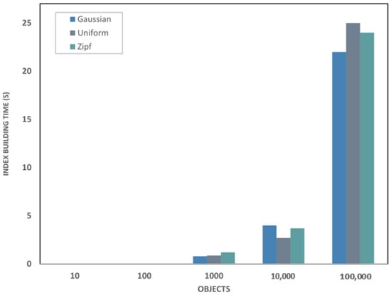 Figure 9 demonstrates the time of building the VeST as we altered the number of objects and their distribution pattern. If further parameters did not vary, the index construction time rose almost linearly with the increasing number of objects. As we made a better concentrated Gaussian pattern, there were additional split and merge processes in the R-tee layer for this one. As a result, the construction time was the highest among the three distribution patterns in most cases.