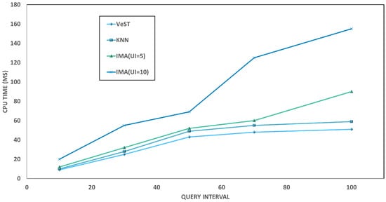 Figure 10 analyzes the impact of the query interval size on the CPU time of VeST and competing approaches. The proposal was compared with the IMA approach suggested by Mouratidis et al. [33] and with the CKNN approach proposed in [34]. The IMA method is based on iterative snapshot kNN search evaluations, unlike the VeST approach, where we avoid the unknown number of iterations. When objects’ location updates occur, the IMA algorithm again evaluated the snapshot KNN query. In our experiments, the IMA update interval (UI) was set once to 5 time units and then to 10 time units to examine both cases and compare it with the VeST algorithm. The IMA algorithm with update intervals of 5 and 10 time units is termed IMA(UI = 5) and IMA(UI = 10), respectively. On the other hand, the CKNN algorithm divided the time interval into disjoint subintervals. These subintervals were evaluated successively in locating the KNNs of the query entity. The experiments showed that the CPU cost rises with the expanded query interval size for all the algorithms. This is because a significant query size derives additional objects to be considered for the continuous KNN search approach and assembles better discrete place updates of objects. Consequently, the IMA algorithm required more snapshot KNN queries (for both UI = 5 and UI = 10); therefore, the CPU time was higher in both cases UI = 5 and UI = 10. The KNN algorithm showed better performances compared to IMA because it divided the time into sequential timestamps; yet, it required more time for a complete KNN search and assumed that objects were moving at constant speeds, which was unrealistic. The simulation outcomes showed that the presented algorithm surpassed its competitors in all cases while continuously considering the dynamic speed feature.