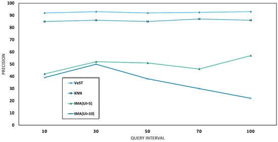 Due to the continuous location updates of objects, the precision was below 60% and 90% for IMA and kNN, respectively. It even reached 20% when the query interval was larger (UI = 10) because the object location updates in these approaches were supposed to be discrete. Therefore, two successive update time instances would obtain imprecise query outcomes. In contrast, the precision of the VeST algorithm was almost equal to 100% regardless of the length of the query interval.
