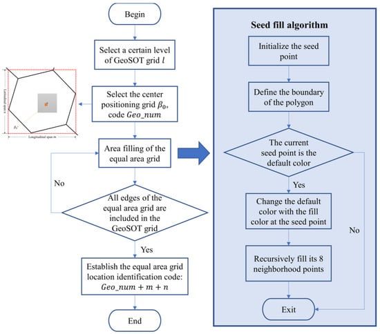 The fitting algorithm for the equal area grid is mainly composed of four parts: “select a certain level of GeoSOT grid”, “select the center positioning grid”, “area filling of the equal area grid” and “establish the equal area grid location identification code”, as shown in Figure 3.