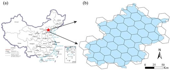 Hexagonal grid fitting of Beijing: (a) The map of China; and (b) Boundary map of the study area.