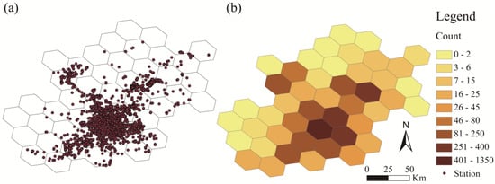 The distribution of public transportation stations in Beijing: (a) The distribution map of POI; and (b) The heat map of POI distribution expressed by hexagonal grid.