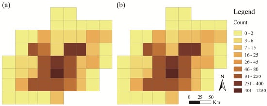The heat map of POI distribution expressed by the 11th level grid of GeoSOT grid: (a) generated using real POI data; and (b) Generated using hexagonal grid data interpolation.