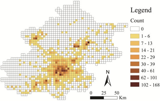 Then, we use particle GeoSOT grids to organize the POI data, take the number of points in the grid as the attributes of the grid, and generate a heat map of the distribution of public transportation stations in Beijing (Figure 10).