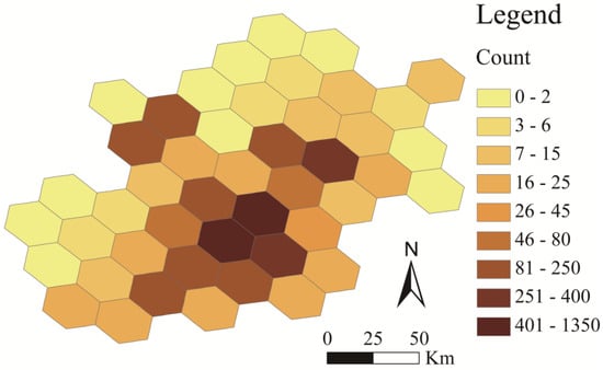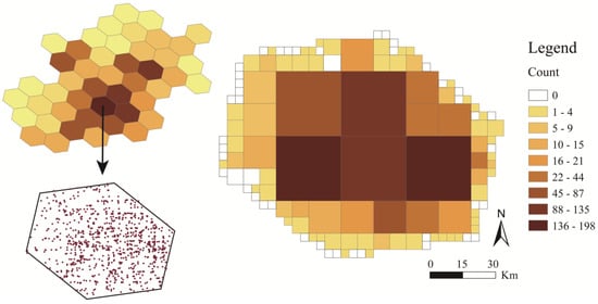 Finally, we gather the attribute information contained in the GeoSOT particle grid upwards into a hexagonal grid, and we obtain the heat map expressed by the hexagonal grid after information transformation (Figure 11).