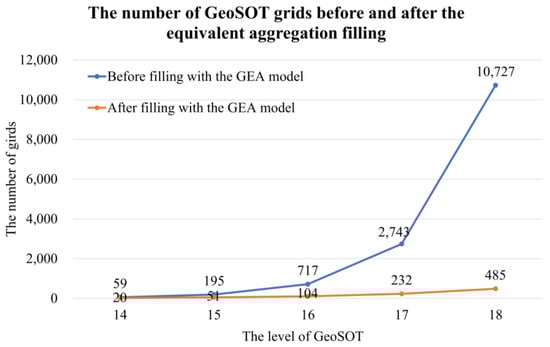 The comparison of the number of GeoSOT grids before and after the equivalent aggregation filling.