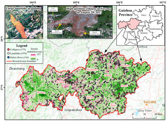 Overview of the study area. The landslide events in this data set are divided into 3 categories: collapse, landslide, and debris flow. (Illustrations of the landslide in Dafang and the collapse in Nayong are cited by Zhang et al. [39] and Zheng et al. [40], respectively).