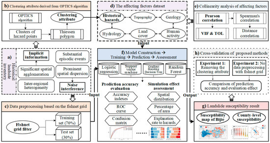 The proposed technical framework of this study is shown in Figure 2. Based on the observation of the landslide inventory of Bijie in Figure 1, we supposed that the typical spatial agglomeration and dispersion characteristics it presented brought implicit susceptibility information and noise interference, respectively (Figure 2a). First, by mining the clustering attribute implied in agglomeration, critical information that reflected the inter-regional heterogeneity was incorporated into the model (Figure 2b). Secondly, we filtered the original data based on the fishnet grid constructed and, in the meantime, generated the training set and test set (Figure 2c). Then, the clustering attribute, together with 14 other factors, constituted the affecting factors data set (Figure 2d). Once the data set successfully passed the collinearity analysis (Figure 2e), it would be input into multiple machine learning models. Thirdly, through comparing the prediction accuracy and the actual simulation effect of each model (Figure 2f), we identified the optimal method, mapped the landslide susceptibility, and analyzed the degree of susceptibility at the city and county levels (Figure 2g). Finally, two further experiments were designed to verify the advantages of our proposed methods and to quantify the impact of these two spatial features on susceptibility assessment (Figure 2h).