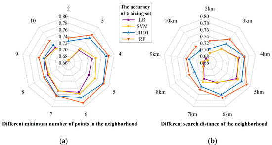 The training accuracy test of different parameter combinations of each model based on OPTICS. (a) Training accuracy under different minimum number of points (search distance fixed at 5 km). (b) Training accuracy under different search distances (minimum number of points fixed at 6).