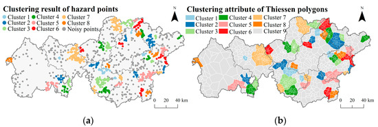 Clustering attribute derived from spatial agglomeration based on OPTICS. The results here correspond to the combination of 6 as the minimum number of points and 5 km as the search distance. (a) Clustering results of hazard points based on OPTICS. (b) Clustering attribute of Thiessen polygons based on point clustering results.