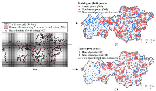 To ensure a balance of positive and negative samples, an equal number of non-hazard points should be generated for training and testing. Non-hazard sample points are generally generated by setting certain distance thresholds or constructing buffers to avoid spatial proximity between the non-hazard and hazard points, thus ensuring that the affecting factors of these two are differentiated [45,46]. Here, a buffer was defined based on 288 raster cells where 1003 valid points were located, and the negative samples were randomly generated outside this buffer (Figure 5b,c).