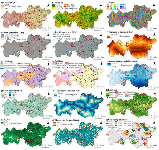 Considering the induced mechanism of landslides, we selected 15 factors from the aspects of topography and geology, soil and hydrology, land cover, human activity, and historical hazards by combining existing studies (Table 1). The spatial distribution map of affecting factors (Figure 6) was drawn based on the WGS_1984_UTM_Zone_48N coordinate system with a resolution of 90 × 90 m. The number of grid rows and columns were 1763 and 3475, respectively, and the total number of grids was 3,389,074. A more detailed explanation on how these factors in Table 1 influence landslide susceptibility is elaborated on in the Supplementary Materials.