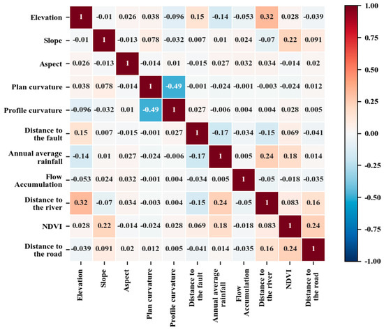 If there was a strong collinearity among the affecting factors, the noise from the redundant information would interfere with the model. Therefore, collinearity analysis was essential. Common applied methods for collinearity validation include correlation analysis and the variance inflation factor (VIF) [21,49]. The former concerns the collinearity between two variables, while the latter focuses on the multicollinearity between one variable and other variables. Here, we adopted the Pearson correlation coefficient for correlation analysis, in which values greater than 0.7 are considered to have a strong pairwise collinearity, and tolerance (TOL) and the VIF (the reciprocal of TOL) for multicollinearity analysis, where a TOL less than 0.1 and VIF greater than 10 indicate a serious multicollinearity problem [50,51].