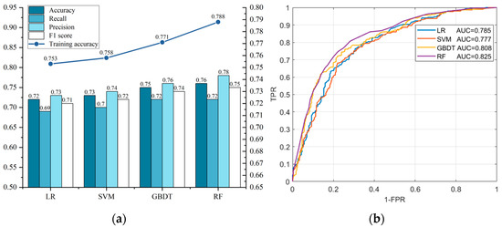 After the exclusion, the training accuracy of the RF model decreased from 78.8% to 72.0%, and the , , and of the test set were also greatly reduced (Table 4). Additionally, the AUC values of the four models in Figure 12b dropped significantly (RF from 0.825 to 0.793). The unfavorable changes in these metrics demonstrate that considering the spatial agglomeration feature can effectively improve the model’s prediction accuracy.