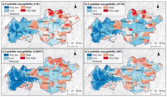 - At the global scale, the spatial distribution and area shares of different levels of susceptibility were more reasonable than those of other methods. For example, the very high susceptibility areas were moderately distributed among the high-value areas of each county (Figure 9d), whereas for LR and the SVM, the very high susceptibility areas were concentrated in blocks in the northernmost areas of Bijie, southwest of Dafang, and northeast of central Qianxi, featuring a local exaggeration which was biased from reality, being especially overestimated in the southwest of Dafang, where there were only six hazard points (Figure 9a,b). For GBDT, the percentage of moderately prone areas was underrepresented, accounting for 17% (Figure 10a).