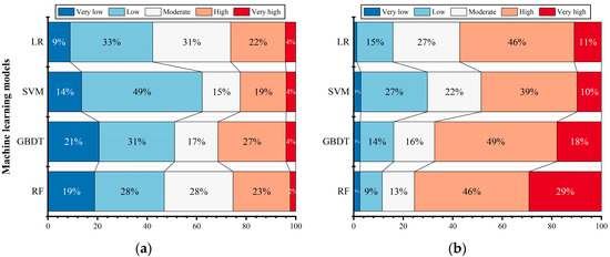 - In terms of the interpretation effect of historical hazards, the more-prone areas (including high and very high areas, the same as those shown below) representing 25% of the RF map area contained 75% of the historical hazard points, and the less-prone areas (including low and very low areas, the same as those shown below) representing 47% of the RF area contained only 12% of the hazard points (Figure 10). This strongly proves the capability of the RF map to effectively reflect the true state of susceptibility. However, other maps did not perform as well, such as the GBDT map with a larger proportion of more-prone areas (31%) which explained only 67% of the historical hazards, while the SVM map with less-prone areas (63%) over-explained 30% of the hazards.