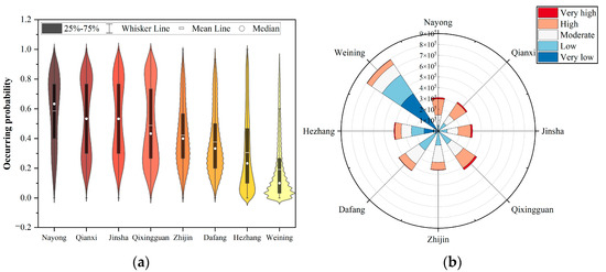 As disaster risk management is generally implemented at the county administrative level, it is necessary to further analyze the susceptibility at the county level to support decision making. Based on the numerical distribution of hazard occurrence probability in all raster cells of each county (Figure 11a), the counties in Bijie can be ranked as three echelons according to the susceptibility level from high to low: the first echelon (Nayong, Qianxi, Jinsha, and Qixingguan), second echelon (Zhijin, Dafang, and Hezhang), and third echelon (Weining). Reflected by the violin plot width (Figure 11a) and proportion of the sector area (Figure 11b), the counties in first echelon were distinguished by a large proportion and area of higher susceptibility, which should be given priority for monitoring and prevention. Among them, Nayong was the most severe one because it only had a sole peak at the high value of probability, compared with the other counties with bimodal distribution in the high and low values (Figure 11a). The overall susceptibility of counties in the second echelon moderately decreased, as evidenced by the mean and median being at the medium level of occurrence probability and the sole peak at the lower value. However, the aggregation of the more-prone areas situated in the local areas deserve attention. For example, the very high susceptibility area in Hezhang is still vast (Figure 11b), so these similar local blocks of high value in the second echelon should be the focus of further investigation. With the high elevation and wide area in the central zone, landslides rarely happened in central Weining in the third echelon. Instead, it developed a distinctive polarization of susceptibility, and thus the main work on future disaster prevention and mitigation planning is advised to be devoted to some higher susceptibility areas to its southeast and northwest.
