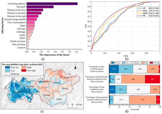 The susceptibility map of Bijie and model performance after excluding the clustering attribute. (a) The importance of factors in the RF model before exclusion. (b) ROC curves and AOC values of each model after exclusion. (c) The landslide susceptibility map after exclusion. (d) Comparison of models’ simulated effects before and after exclusion (the percentage of area in the very high level after exclusion was 0.35%, and the percentage of points in the very low level after exclusion was 2%).