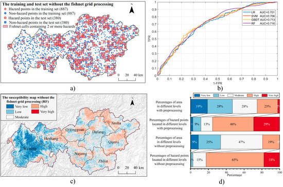 The susceptibility map of Bijie and model performance after removing the data preprocessing of the fishnet gird. (a) Distribution of training and test sets without fishnet grid processing. (b) ROC curves and AUC values without fishnet gird processing. (c) The susceptibility map without fishnet grid processing. (d) Comparison of models’ simulated effects before and after processing (the percentage of area in the very high level without preprocessing was 0.25%, and the percentage of hazard points located in the very low level without preprocessing was 0.39%).