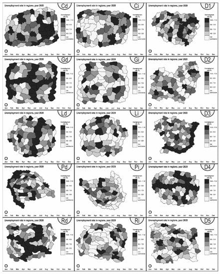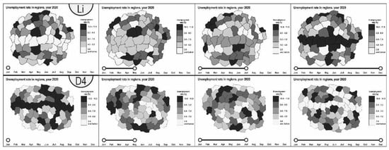 Regularities in geographical space can be viewed as spatial patterns or temporal trends []. The spatial pattern is related to the distribution of a phenomenon in physical or administrative space []. In geographic research, one can distinguish several patterns: clustered, peripheral, grid, linear, radial, or dispersed patterns [,,,]. In animated maps, these patterns change over time. However, despite the changes, several trends occur. The most basic temporal trends are an increase in phenomena, a decrease in a phenomenon, or the absence of a trend [,]. Of course, a more detailed breakdown of temporal trends considers increases and decreases, e.g., linear or logarithmic. In addition, it can also be cyclical.