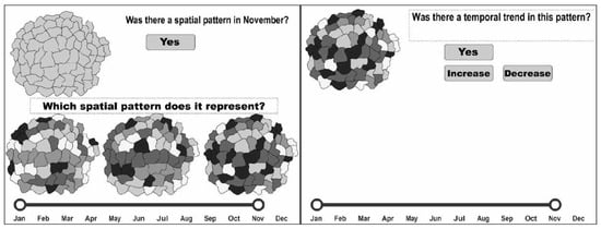 Spatio-temporal data include data classifications according to changes occurring over time [,]. One can distinguish existential changes (disappearance/appearance), spatial property changes (visual variables), or thematic property changes (increase/decrease). Earlier, Peuquet [] distinguished the space (where), time (when), and object (what) components of spatio-temporal data. Andrienko et al. [] extended this issue. Identification and comparison tasks could serve as elementary searches or general searches since there is the possibility of distinguishing spatio-temporal map-based tasks. Such cartographic tasks do not contradict the phenomena taking place in geographical space. Moreover, many phenomena that change in space and time show regularities []. The correct identification of regularities is possible, among others, owing to an appropriate cartographic presentation. To estimate the correctness of the users’ perception of these regularities, one needs to design appropriate map-based tasks [,].