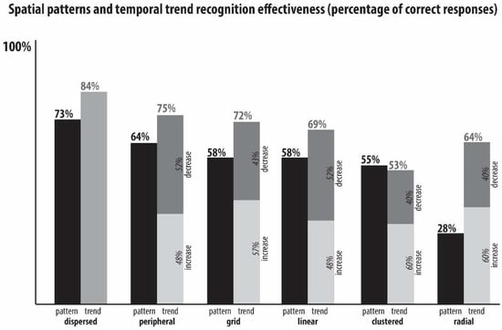 The recognition of spatial patterns was found to be more difficult than the recognition of temporal trends. Based on the results, the most effective was the dispersed pattern. This proves previous assumptions that animated conditions support both the lack of pattern recognition and strong pattern recognition []. This is also true for the recognition of temporal trends, which did not appear while displaying dispersed pattern maps. It was found that most of the patterns analyzed in this study had similar effectiveness (from 55% to 64%). The only exception was the radial pattern, which had the lowest effectiveness (28%). This type of spatial pattern is related to road and railroad mapping [].