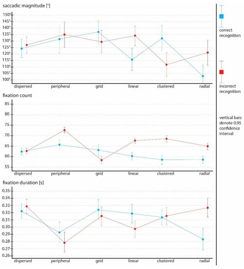 Inconsistency between the spatial patterns regarding correct and incorrect responses among the selected eye tracking metrics is visible. It should be noted that different spatial patterns require various visual behaviors for effective performance. The main factor crucial for determining effective visual behavior is the fixation count. Statistically significant differences between the saccadic magnitude in the linear, clustered, and radial patterns might indicate that these are more complex patterns for visual analysis. Since the dispersed, peripheral, and grid patterns had similar saccadic magnitude differences, shorter saccades could be crucial for effective recognition of these patterns. This might be confirmed by the finding that these patterns had similar visual strategies according to the fixation count.