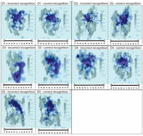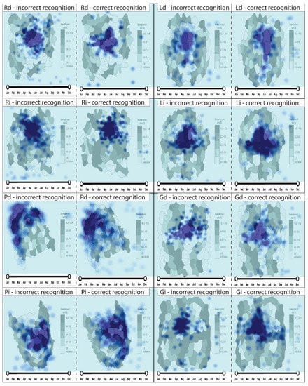When analyzing the lack of patterns (dispersed pattern), the results are not as clear as when there was a presence of a spatial pattern. Participants’ fixation clusters occur in both incorrect and correct recognition. In the case of the D1, D2, and D4 maps, the cluster distribution is similar to the case of the occurrence of the spatial patterns and temporal trends. Correct recognition fixation clusters cover a larger area. The situation is different when analyzing the D3 and D5 maps. In both cases, the incorrect recognition fixation clusters cover a larger area than the correct recognition fixation clusters. Figure 7 presents the result of Kernel Density based on the participants’ fixation and recognition.