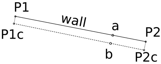 The solid line represents the surface of the wall, which should coincide with the boundary line. The distance between the wall points (P1 and P2) and the positions determined by the coordinates (P1c and P2c) is almost 20 cm. They are treated as equal, i.e., by law, the wall is identical to the boundary line. In version a, the point is marked and surveyed directly at the wall. This results in a bent boundary line (P1c–a–P2c). In version b, the new boundary point is calculated mathematically, but when staking it out, the position that has to be marked is not on the boundary in the field.