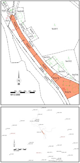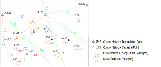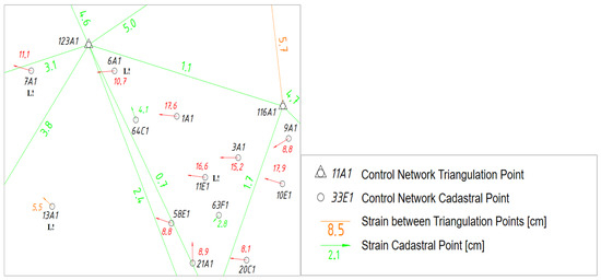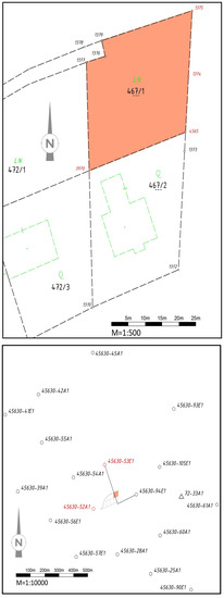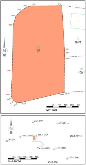 The bottom of Figure 2 shows the control point network in the area. Control points 45634-6A1 and 45634-34E1 were originally used to connect it to the cadastral survey. The originally used control point 45634-34E1 was lost in 2001. Point 45624-64C1 (approximately 20 cm from the original point) is used for the further calculations in this example. The effects of network distortions on this point are assumed to correspond to those of the lost point.