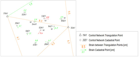 The control points 45611-172E1 and 45611-41C1 have relative residuals (the difference between their respective residuals) of 12.7 cm in the Y-direction and 0.5 cm in the X-direction. The distance between them is only 206 m, resulting in a scale factor of 617 ppm, exceeding the limit of 100 ppm. Possible reasons for this include problems with the original determination of the coordinates or soil movement. The problem was not present in the 2006 survey. Two aspects seem plausible: (i) the traverse used in 2006 has an s-shape—the limits for the traverse tolerance use the length of the traverse and this could have masked the stress—or (ii) the land movement started to accelerate after 2006. Overall, the control point network in the area is distorted. Figure 5 shows the strains of the homogeneous vectors of the control points. The colour, size, and direction of the arrows provide information about the homogeneity of the individual control points. The annotation “L!” identifies control points determined by aerial photogrammetry in the 1970s. The strains in the network are clearly visible because there is no visible systematic in the direction of the distortion errors. In particular, the large arrows (in red) point in varying directions.