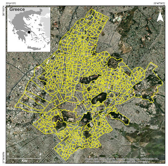 MoA is a central municipality of AMA and is located in Attica prefecture, in the central part of Greece (Figure 1). Athens is the capital and the largest city of Greece. MoA has a population of 664,046 inhabitants, which makes it the one of the most populous municipalities in the European Union and extends over an area of almost 40 km2. The urban fabric of Athens is the most densely populated (over 16.600 habitants/km2). The trend towards the development of large urban centers, as well as the demographic eruptions of previous decades, created the need for housing development. The study area is divided into 494 Urban Analysis Units (URANUs) that correspond to the spatial unit of analysis (Figure 1). These spatial units are assumed here as neighborhoods of similar size as they have ~1000 inhabitants each.