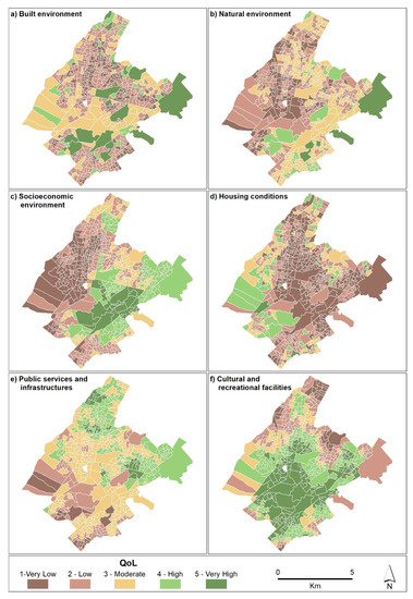 Thus, for the criterion of the built environment, the lowest levels are noticed north of the city center and in the southern neighborhoods (Figure 2a). On the other hand, the highest levels are observed mainly in the larger area neighborhoods, where open spaces are concentrated. The lowest scores of the natural environment are noticed in the city center and in the western-northwestern neighborhoods, whereas a better natural environment is revealed only in limited neighborhoods at the eastern part of MoA (Figure 2b). A solid cluster of very low socioeconomic environment is located in the western part of MoA (Figure 2c), in contrast to the central and eastern neighborhoods which are characterized by a higher socioeconomic profile. Most of the dwellings in MoA are old apartments and only in limited neighborhoods are either newly built blocks of flats or detached houses found. This is evident in the housing conditions criterion (Figure 2d), revealing low and very low levels across the whole study area, except the southwestern neighborhoods. Regarding the public services and infrastructures, deprived neighborhoods are noticed in the southern MoA (Figure 2e). These neighborhoods are mostly industrialized/logistics areas with lack of hospitals and limited school facilities. In contrast, the northern and north-eastern part of the city scores higher levels. Finally, the cultural and recreational facilities criterion revealed a very common status of large city centers. All these kinds of facilities are mainly concentrated in the city center; therefore, the access to them is gradually decreased from the center (Figure 2f).
