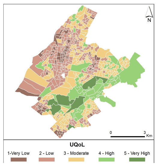 All the composite criteria as well as the overall UQoL were mapped, and a set of thematic maps that demonstrates UQoL levels within MoA’s neighborhoods was created. The results were validated according to the residents’ perception of the UQoL. The residents were asked to define the postal code of their residence area, and rate it from 1 (very low) to 5 (very high) in terms of the geographical environment and UQoL. Each URANU belongs to one of the 90 wider postal code areas of MoA. Thus, the median value of overall UQoL in each postal code based on the URANU scores of the proposed methodology was calculated and validated to the corresponding median value of the residents’ perceptions.