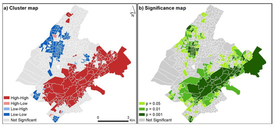 Next, spatial autocorrelation was examined using both global and local Moran’s I indicators [43,44]. Global Moran’s I evaluates whether the overall spatial pattern under investigation is clustered, uniform or random. Spatial autocorrelation is measured based on both feature locations and feature values simultaneously. Along with the global Moran’s I, both a z-score and p-value are calculated to evaluate the significance of the indicator. Local Moran’s I evaluates the local spatial autocorrelation between neighboring spatial units, providing a cluster map where geographical units with similar values cluster spatially. The local spatial autocorrelation types can be distinguished as “High-High” (high-value spatial units surrounded by units with similarly high value) and “Low-Low” (low-value units surrounded by units with similarly low value) spatial clusters, and “High-Low” (high-values surrounded mainly by low values) and “Low-High” (low value units surrounded mainly by units with high values) spatial outliers.