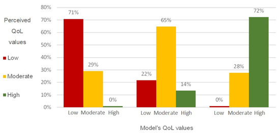 Accuracy (%) of the model’s estimated values according to the residents’ perceived values, per low, moderate and high level of UQoL.